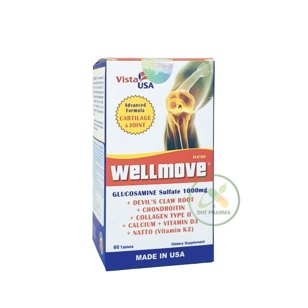 Bổ khớp WELLMOVE Vista USA giúp bổ sung dưỡng chất cho khớp, hỗ trợ làm trơn ổ khớp, giúp khớp vận động linh hoạt, giảm đau mỏi khớp, hỗ trợ giảm nguy cơ thoái hóa khớp.
